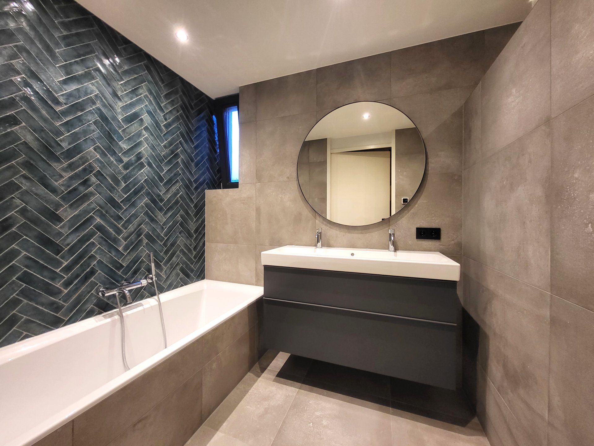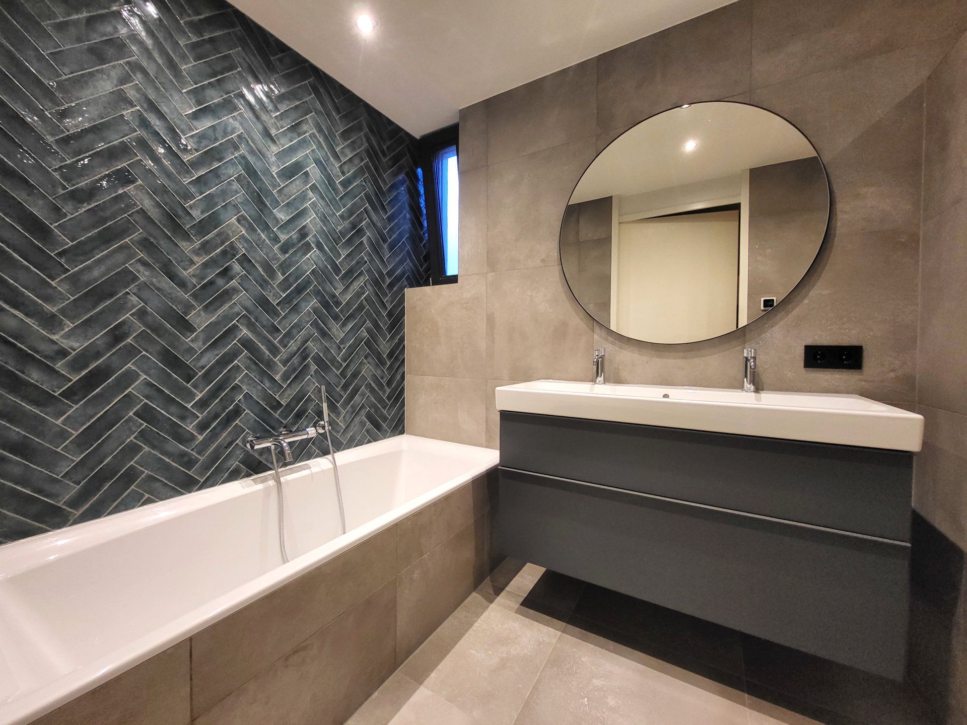 Sanitair: witte wastafel en bad met kranen in chroom en een ‘lava’-kleurig wastafelmeubel.