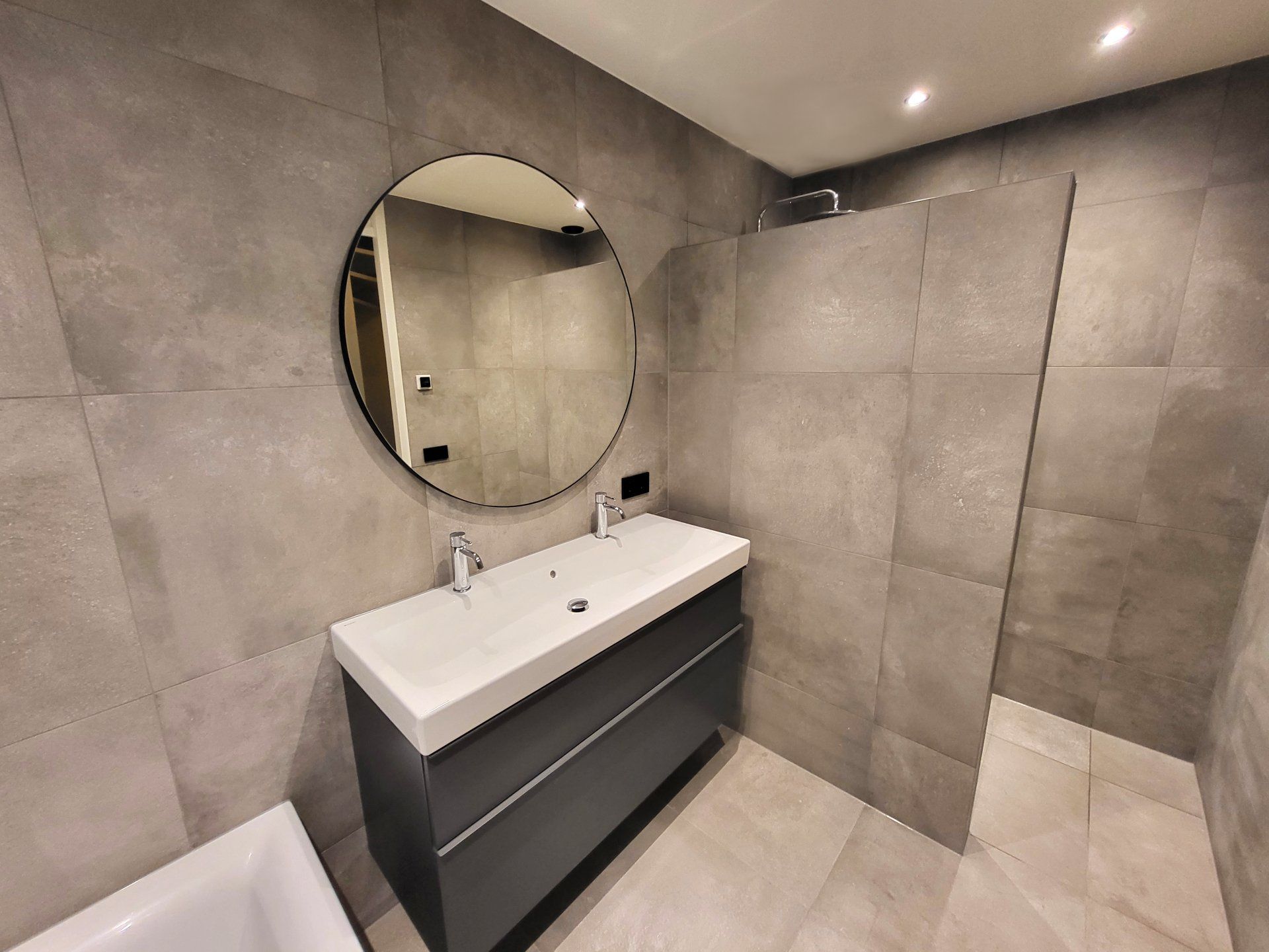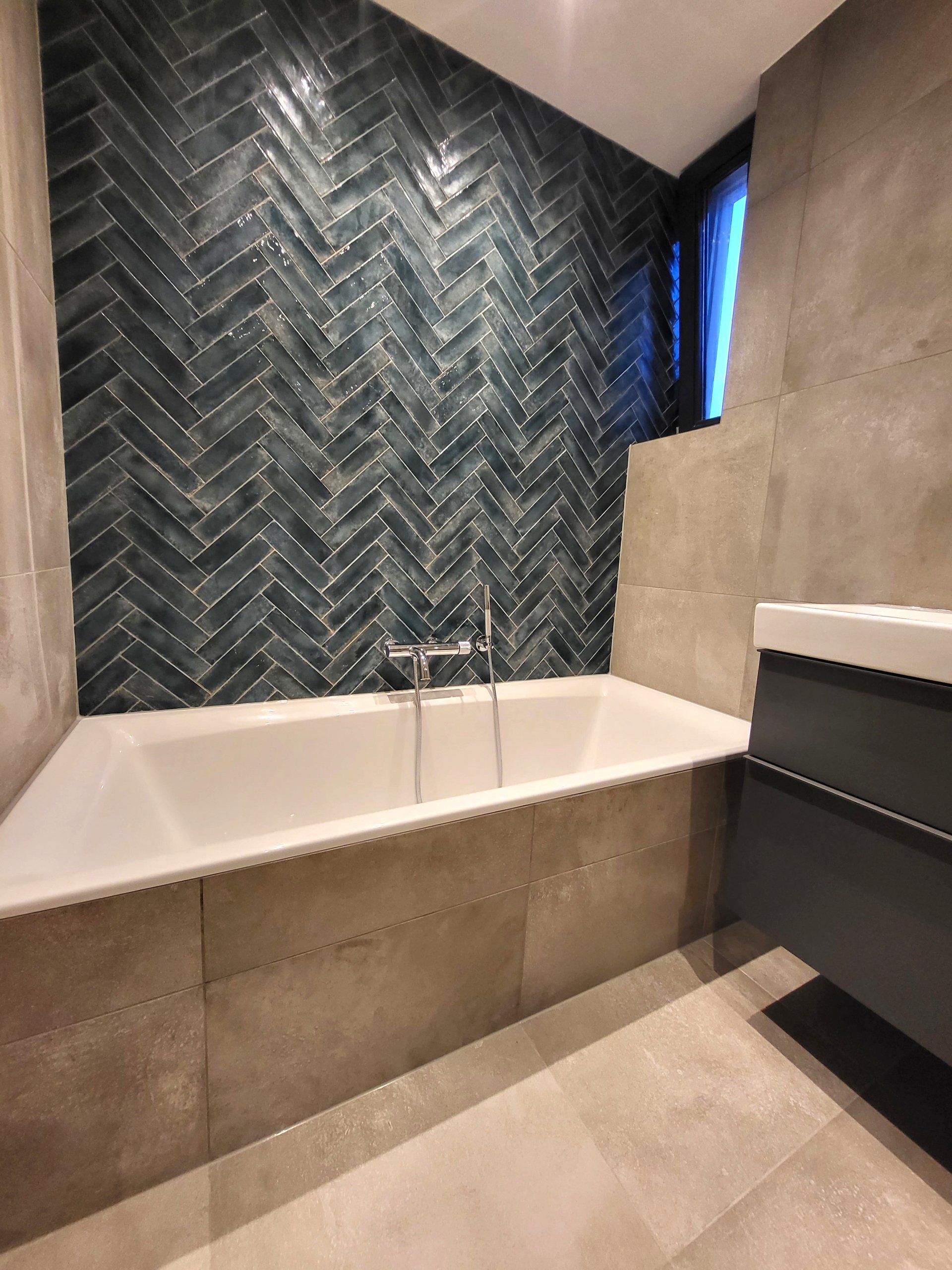 Tegelwerk: Keramische vloertegels in de maat 60x60cm, toegepast op de vloer en de wanden. Met als eyecatcher boven het bad, keramische handvormtegels.