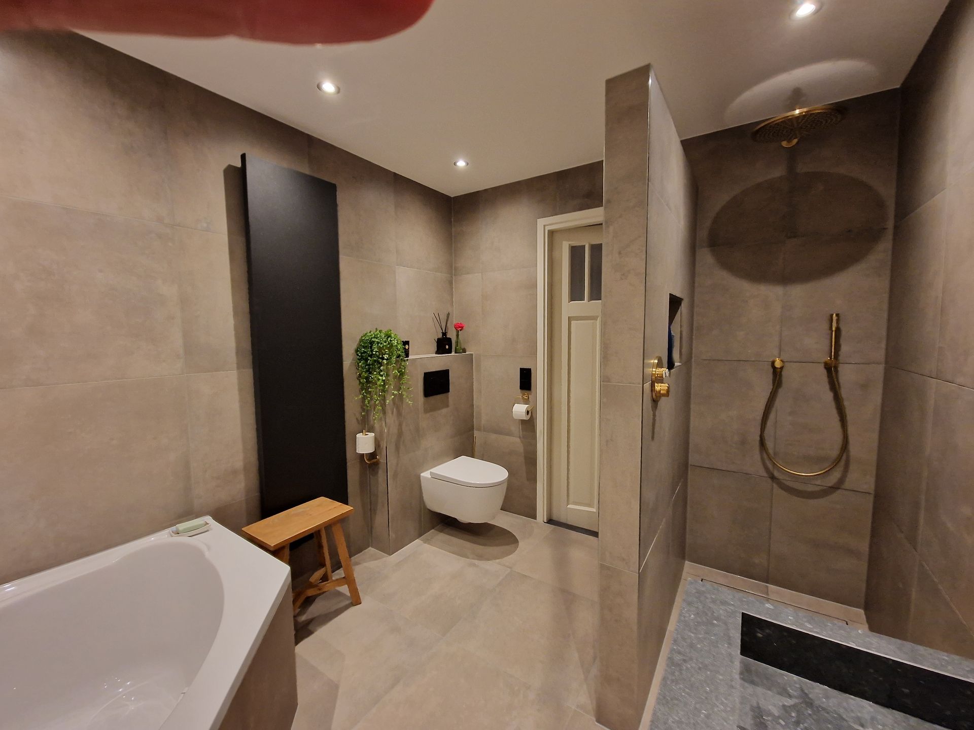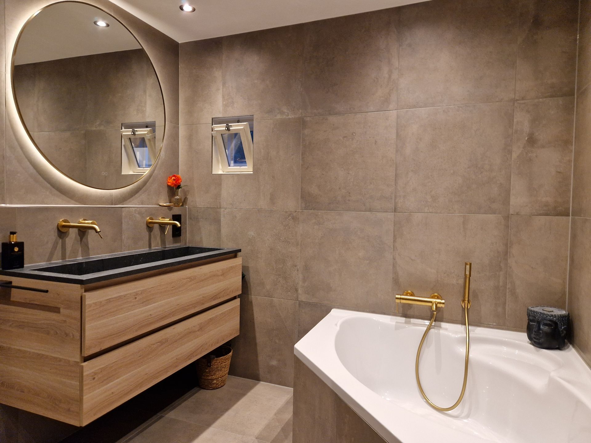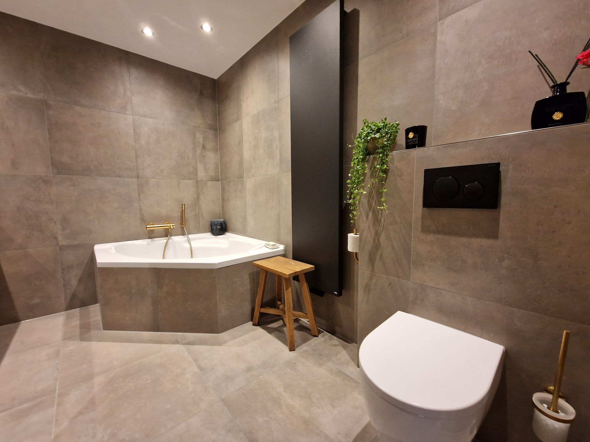 Deze week hebben wederom weer een hele gave badkamerverbouwing mogen opleveren. De ruimte is zeer ingrijpend aangepakt, maar het resultaat mag er wat ons betreft dan ook zeker zijn. De uitstraling van de ruimte is door de taupekleurige tegels helemaal van deze tijd en de gouden (inbouw)kranen zijn een onwijs gave eyecatcher.