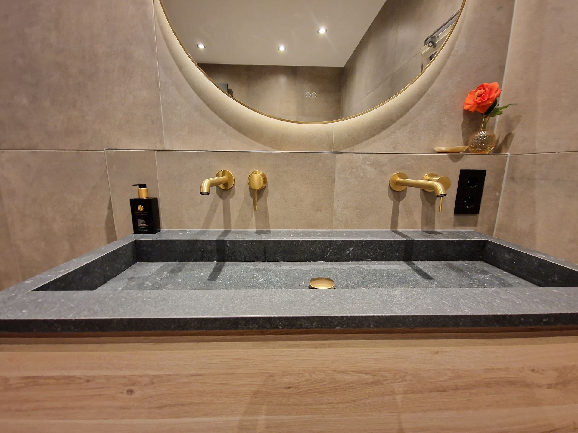 Sanitair: (inbouw)kranen in Grohe's merskpecifieke kleur ''Brushed Cool Sunrise". Hardstenen wasbak met eikenlook onderkast. Gecombineerd met een aantal mat zwarte details.