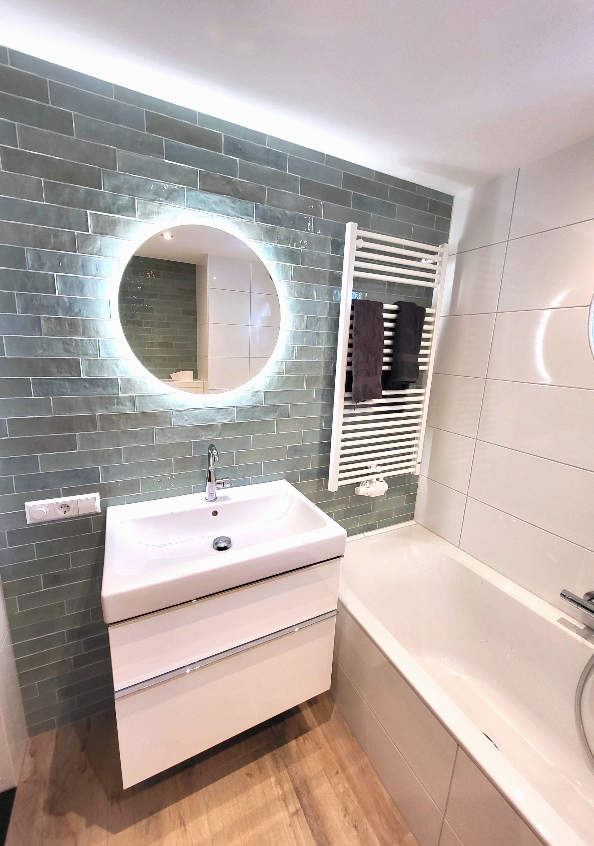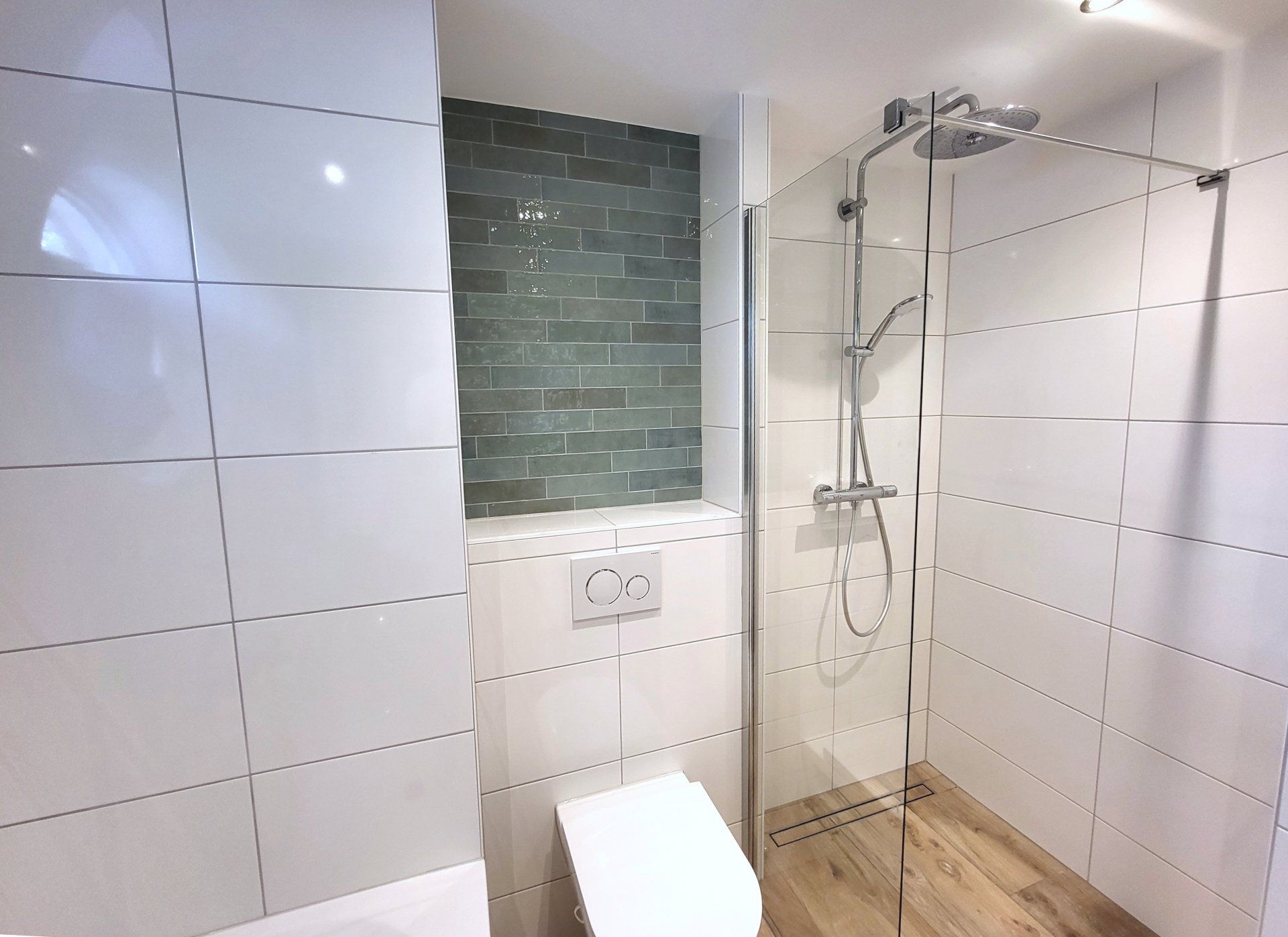 Tegelwerk: keramische wandtegels 30x60cm wit, handvorm 6,2x25cm in groentint en eikenlook houtstroken 30x120cm.