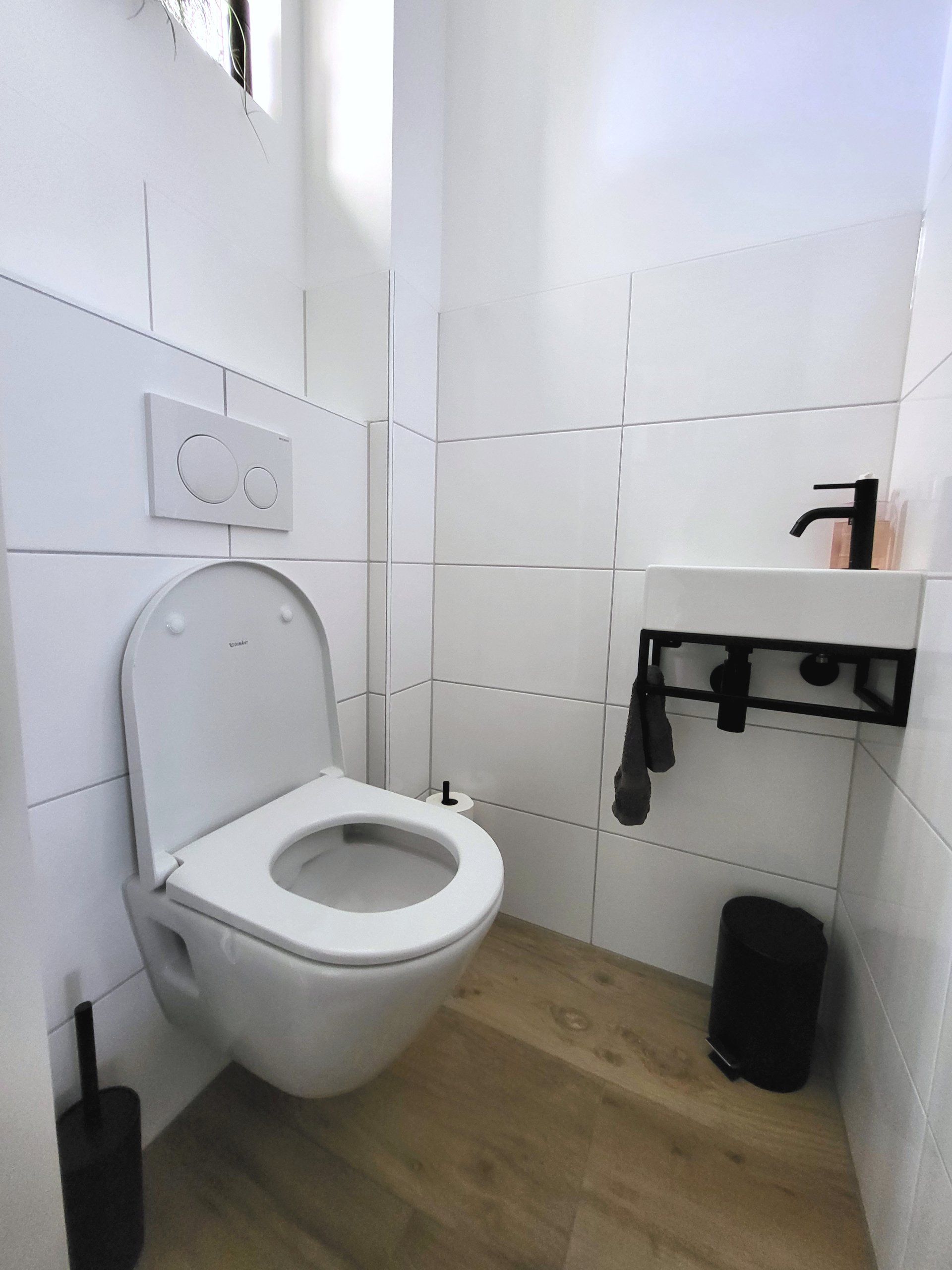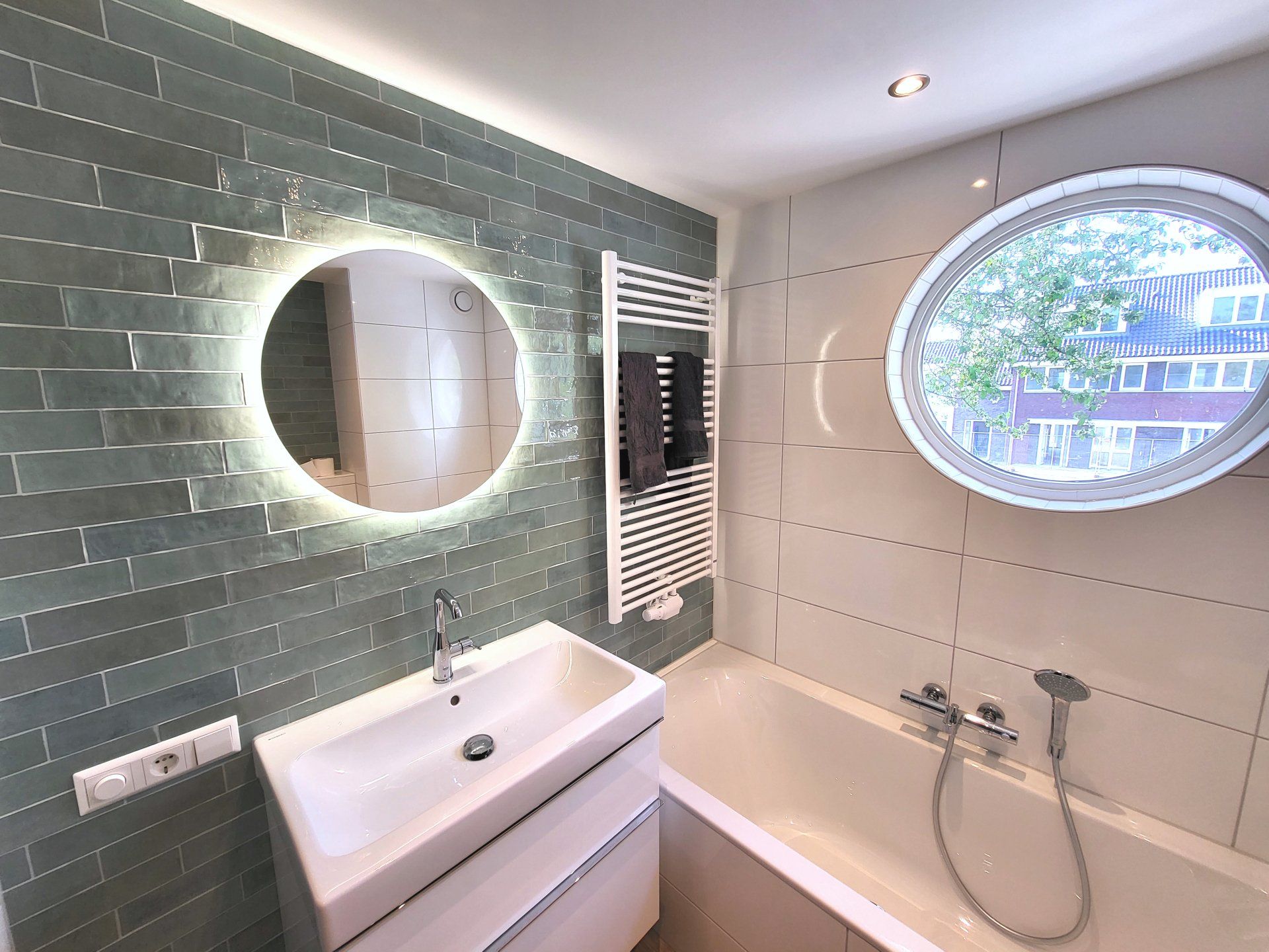 Kortom, de ruimte is van alle gemakken voorzien, zonder dat het krap of benauwd aanvoelt. Dit komt mede door het gebruik van lichte kleuren en de natuurlijke lichtinval door het grote raam. Het raam is direct ook een van de grotere uitdagingen in deze ruimte. Zie een rechte tegel namelijk maar eens rond te krijgen….