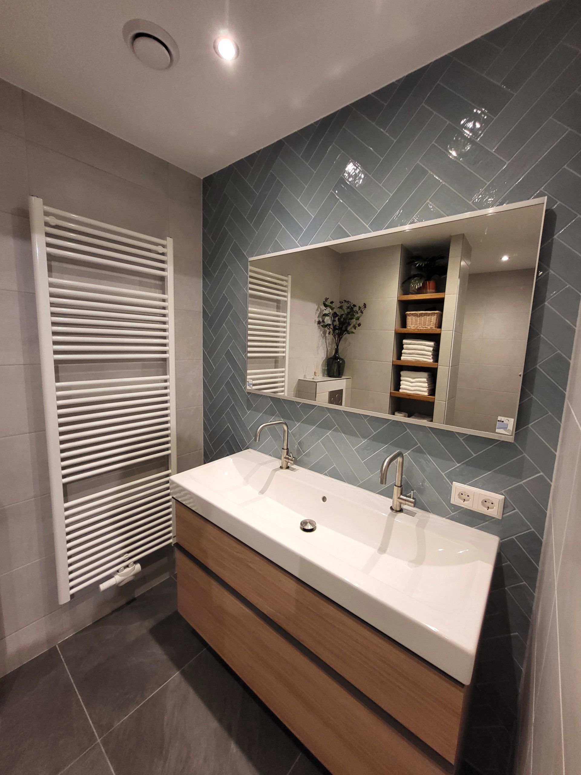 Keramische wandtegels 30x60cm in lichtgrijs op de wanden met blauwe handvormtegels op de wand achter het wastafelmeubel in dubbel visgraat als accent. Antraciet vloertegels 60x60cm op de vloer.