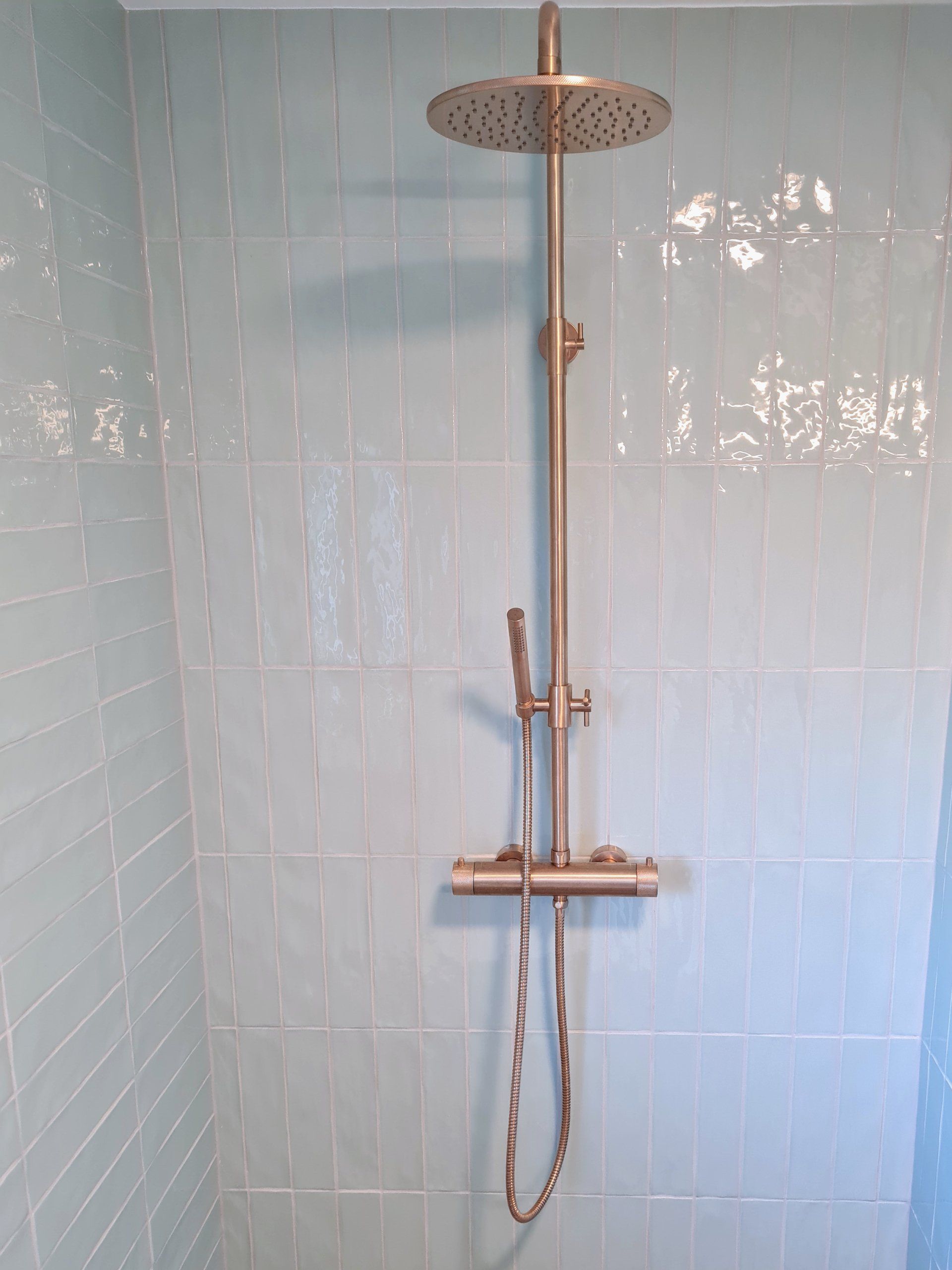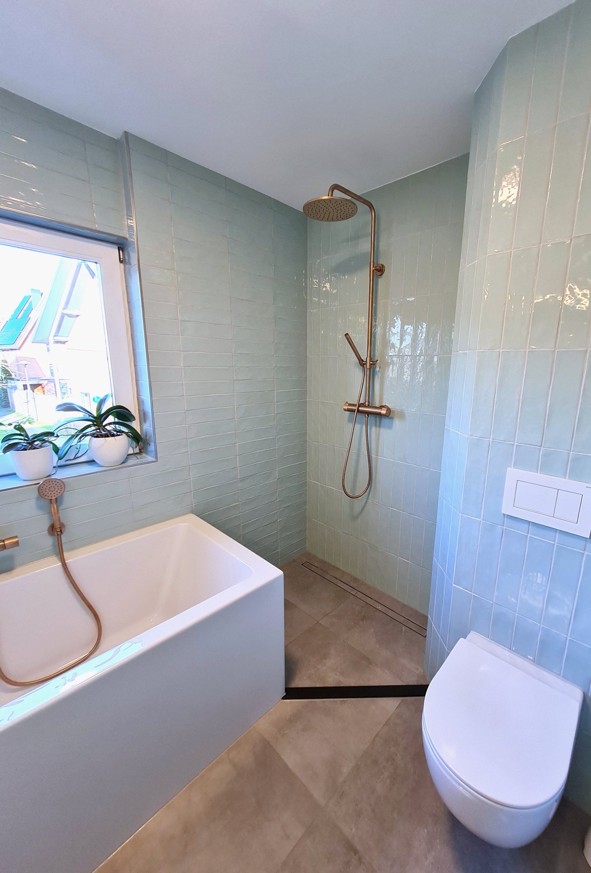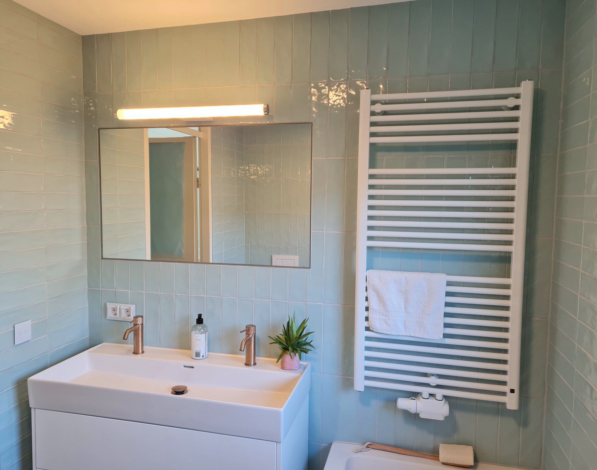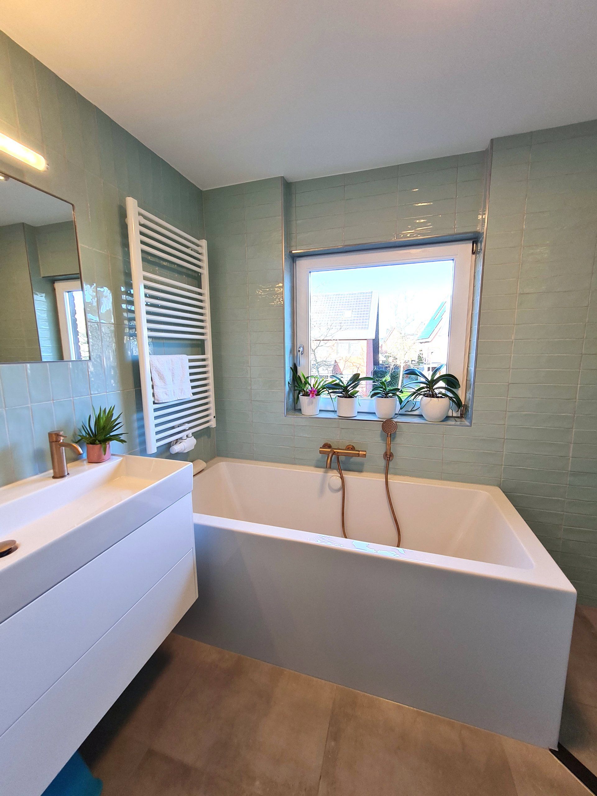 Vanaf de standaard inrichting vanuit de bouw hebben we de transformatie gemaakt naar een luxe badkamer (en toilet) die van alle gemakken voorzien is. De groene handvorm tegels zorgen voor een frisse look. Deze zijn bewust zowel horizontaal als verticaal aangebracht. De goudkleurige kranen sluiten hier mooi bij aan en zijn helemaal van deze tijd.