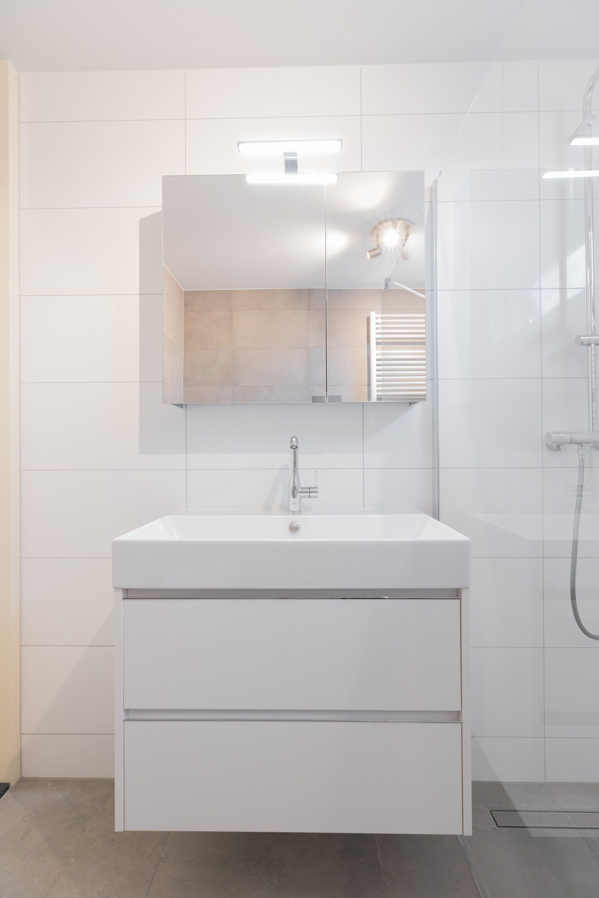Er is gebruik gemaakt van 3 verschillende soorten tegels, welke goed op elkaar aansluiten. Op de wanden is gebruik gemaakt van vloer- en wandtegels in het formaat 30x60cm. Voor een speels effect is op het inbouwreservoir gebruik gemaakt van een strokenmix in dezelfde kleur als de achterwand. Op de vloer zijn tegels gebruikt in het formaat 60x60cm, welke goed aansluiten bij de twee soorten wandtegels.
