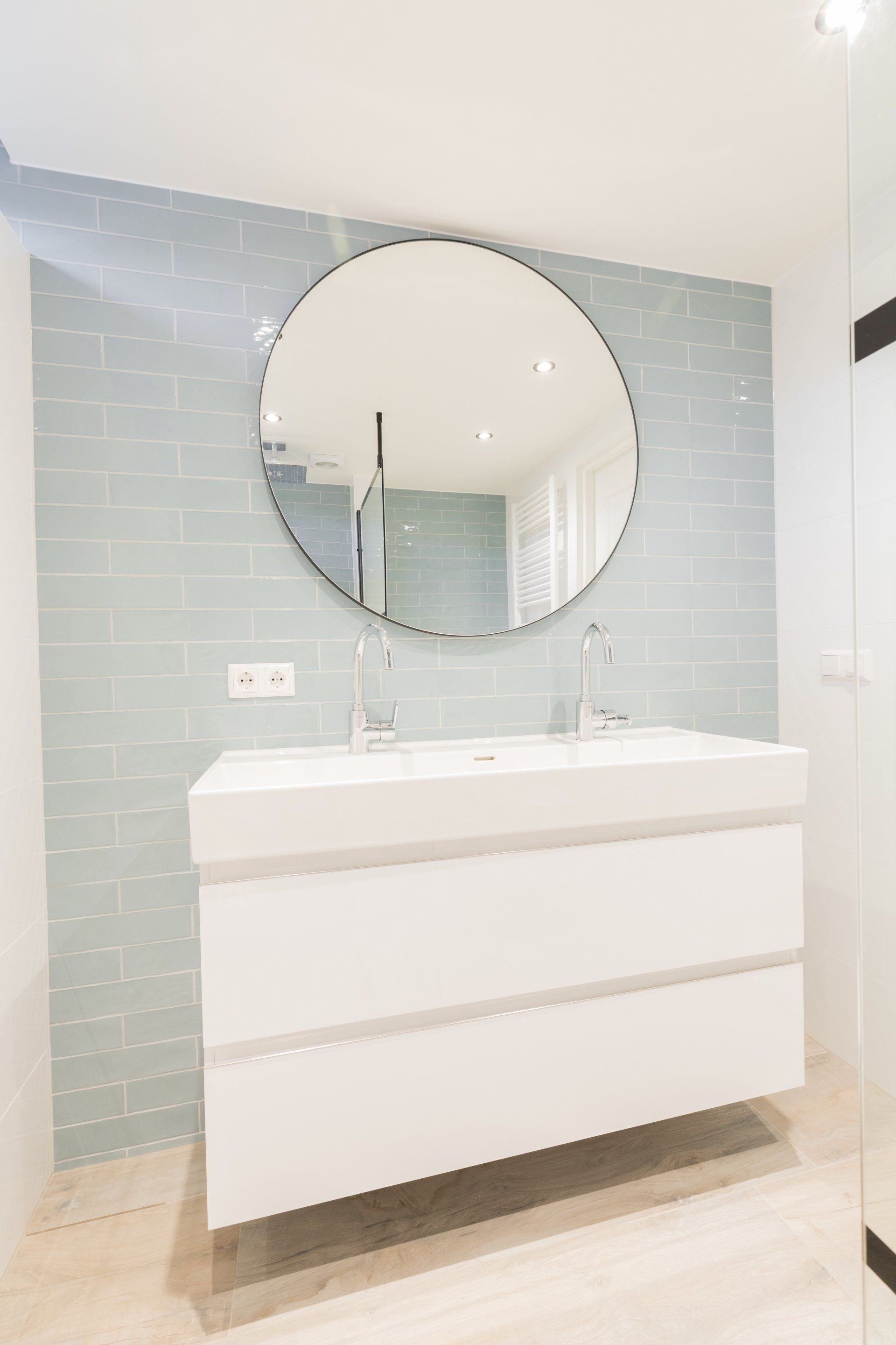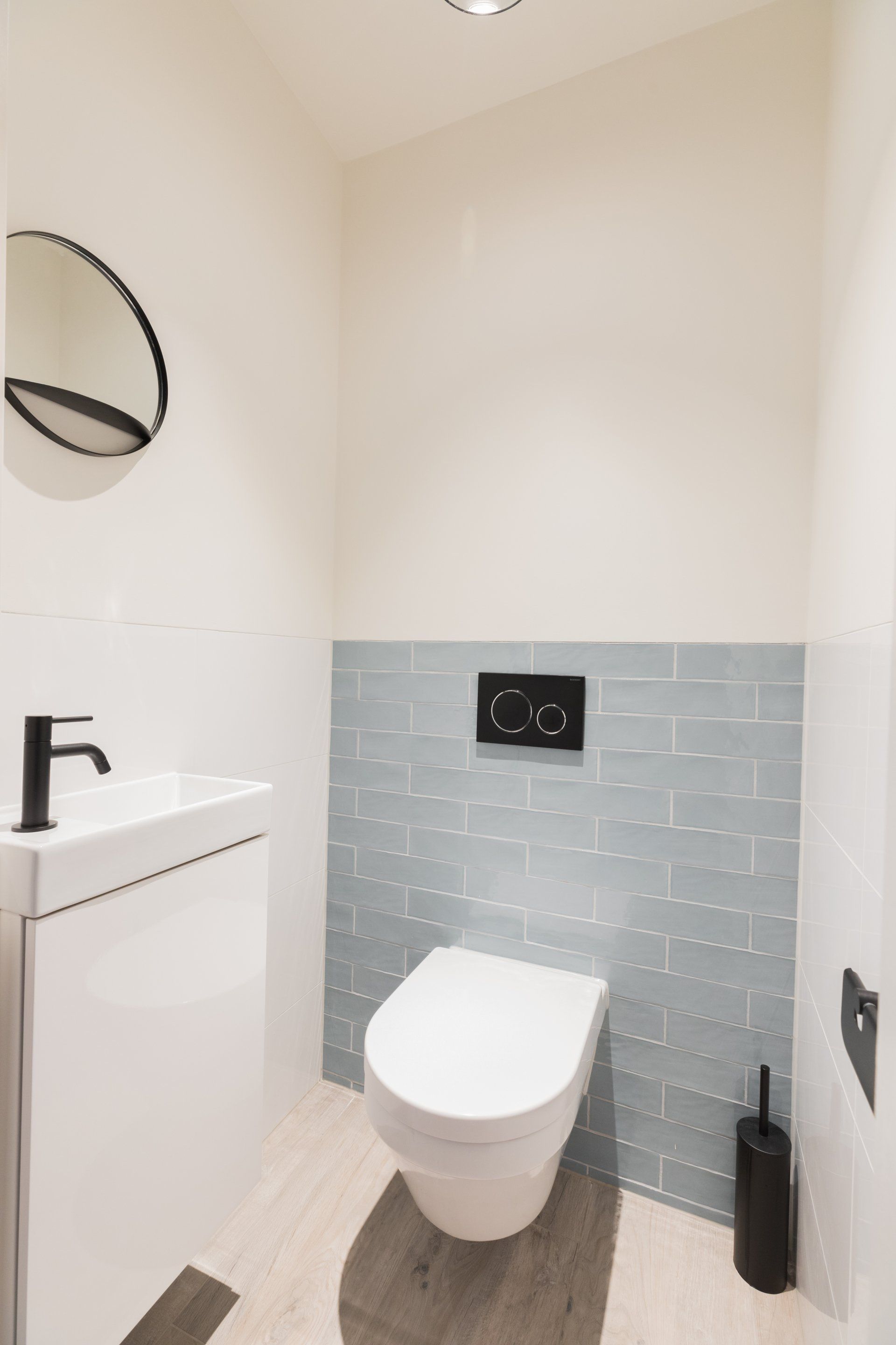 Om samenhang in de natte ruimtes te behouden is er voor gekozen om de twee ruimtes in gelijke stijl uit te voeren. Op de wanden is voornamelijk gewerkt met wandtegels glans wit 30x60cm. Op een aantal plekken is dit afgewisseld met lichtblauwe handvormtegels, welke in halfsteens verband zijn aangebracht.
