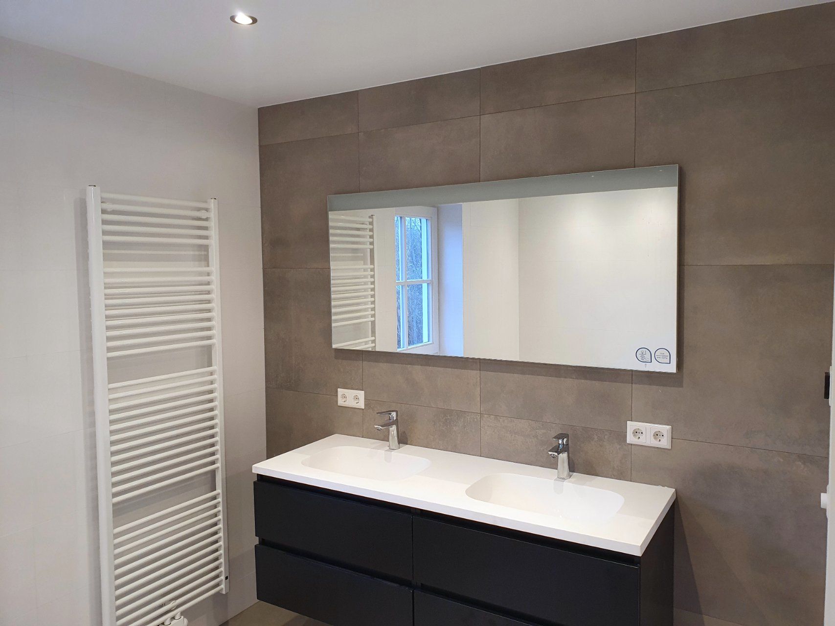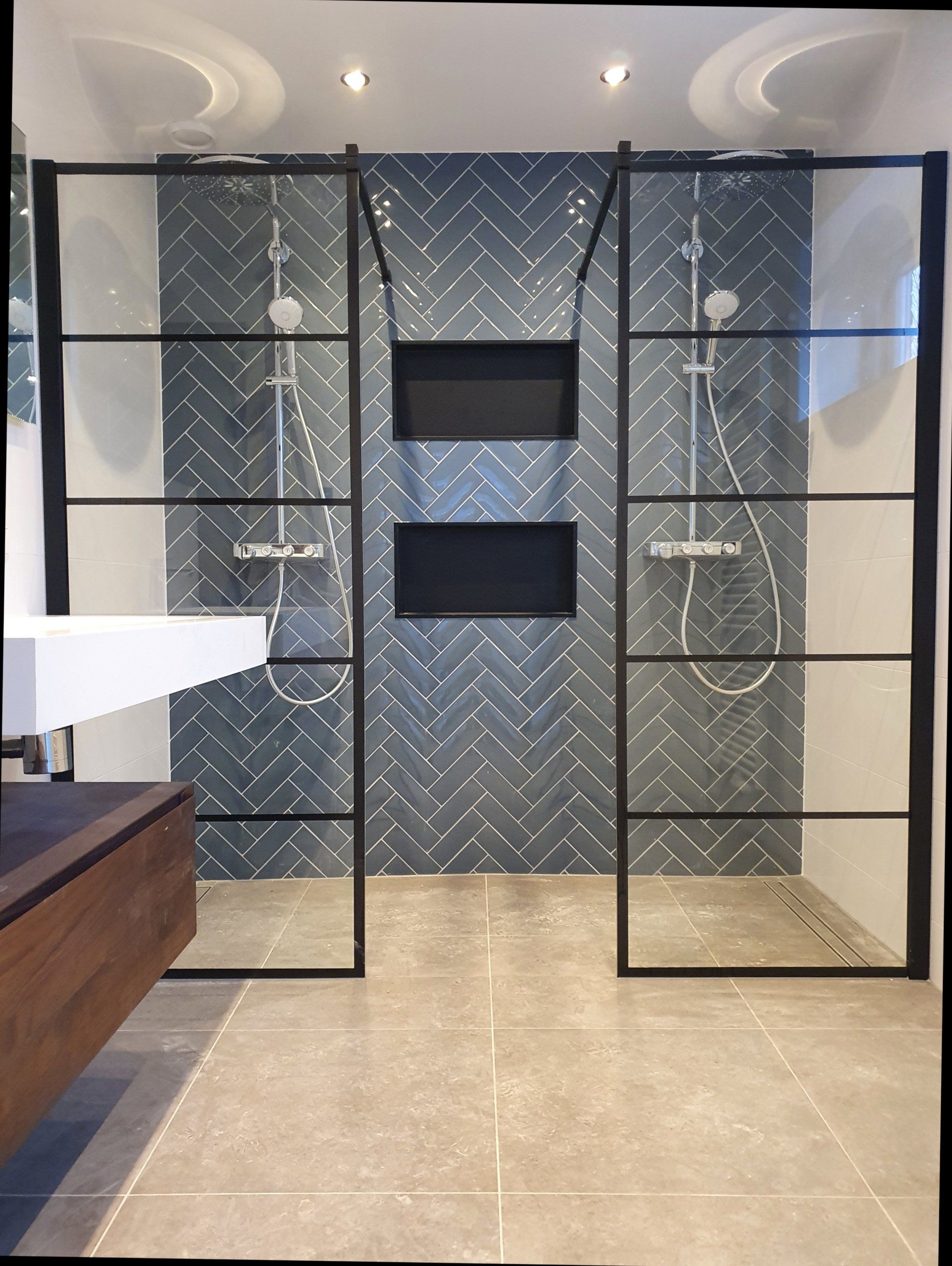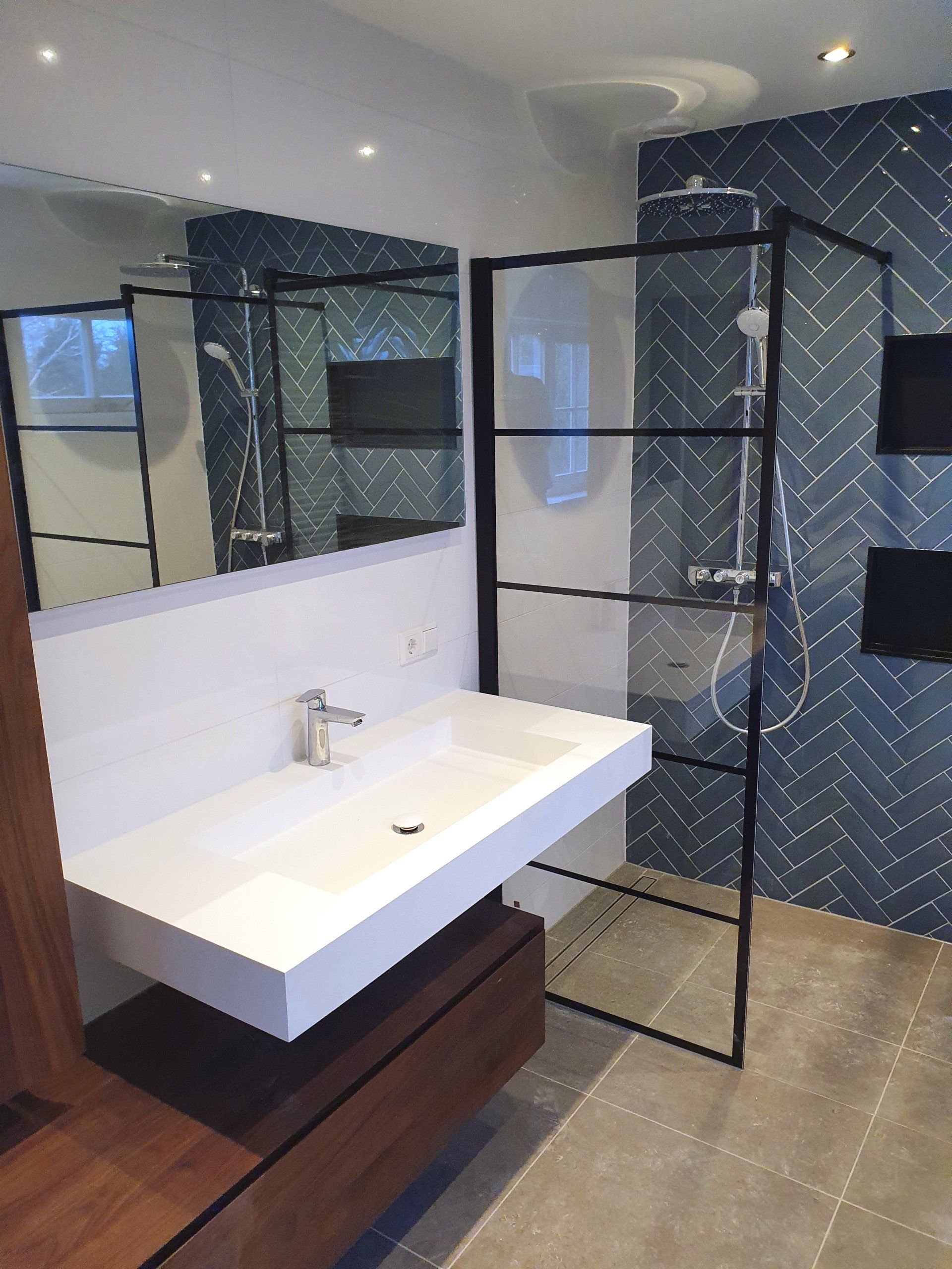 Eén van de eyecatchers in deze woning is de achterwand in één van de royale badkamers. Deze is volledig uitgevoerd met handvorm wandtegels in visgraatpatroon. De matzwarte inbouwnissen sluiten hier qua kleur mooi op aan en bieden op subtiele wijze voldoende opbergruimte.