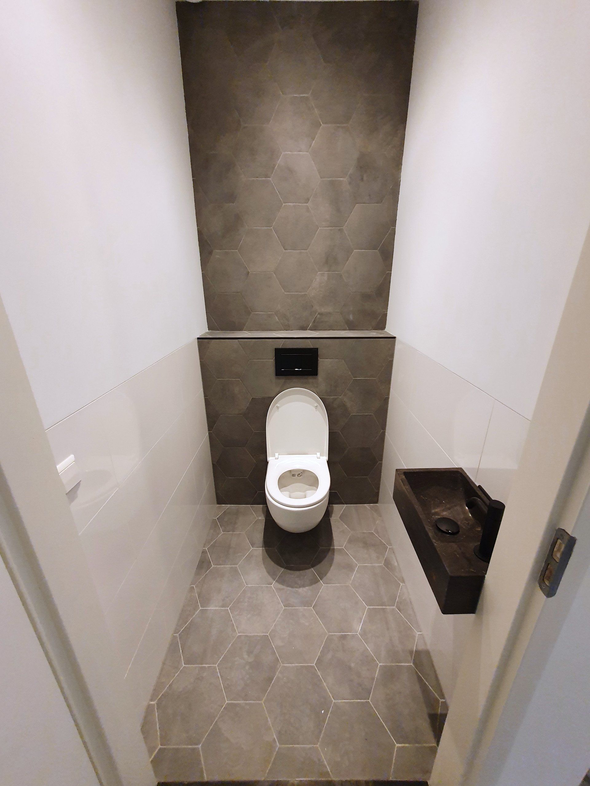 In de toiletten is gebruik gemaakt van hexagonale vloertegels, welke over het inbouwreservoir en de achterwand doorlopen tot het plafond.