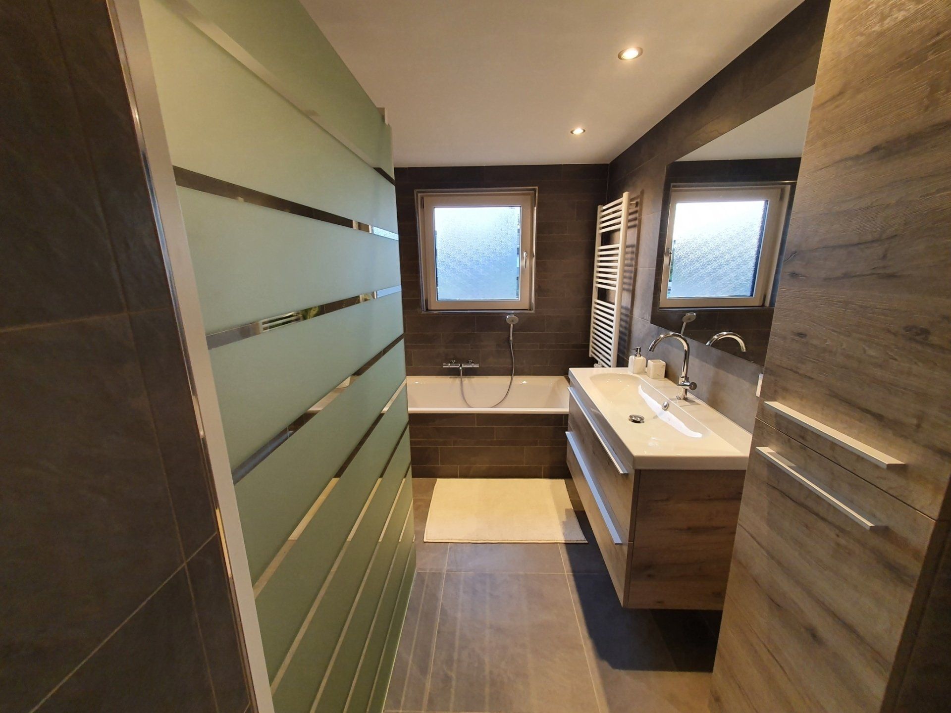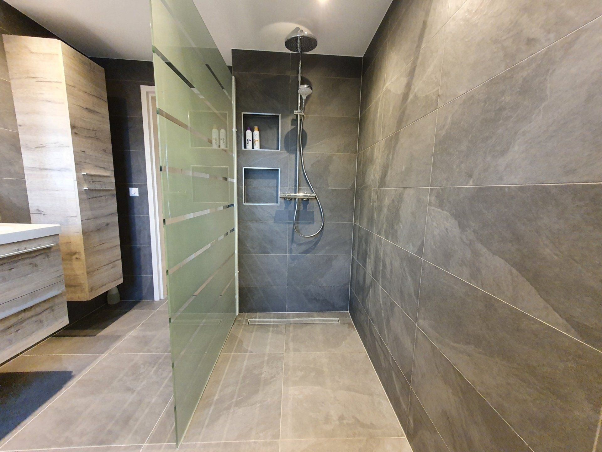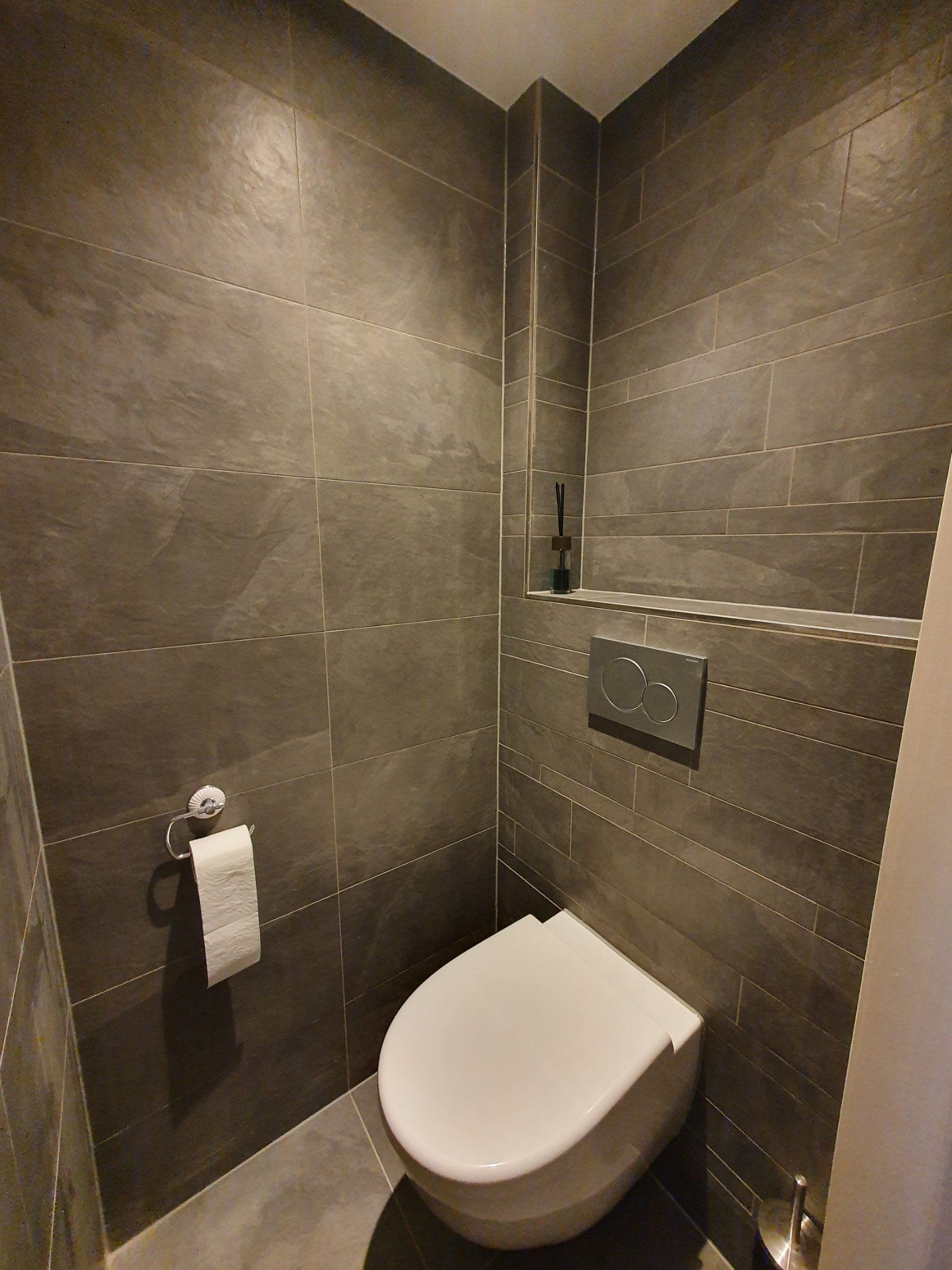 In beide ruimtes is gebruik gemaakt van één soort tegels, welke van zichzelf vrij donker zijn. Maar door het aanbrengen van een verlaagd plafond met de juiste verlichting oogt de ruimte in werkelijkheid alles behalve donker of benauwd. Door het toilet en de badkamer in dezelfde stijl uit te voeren ontstaat er een mooie eenheid van de natte ruimtes in de woning.