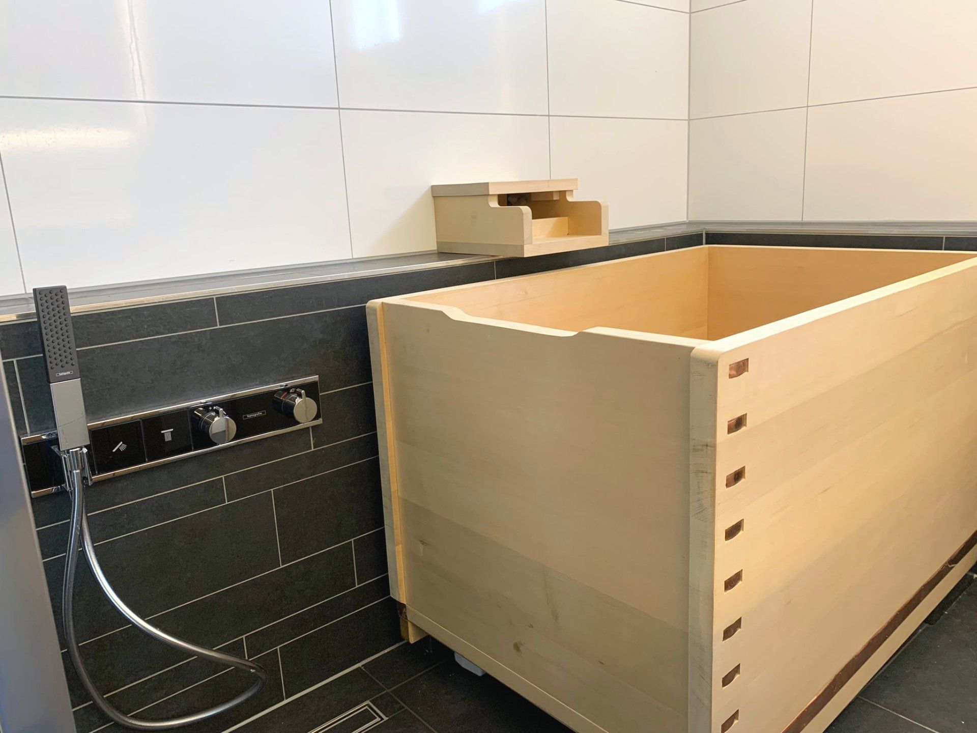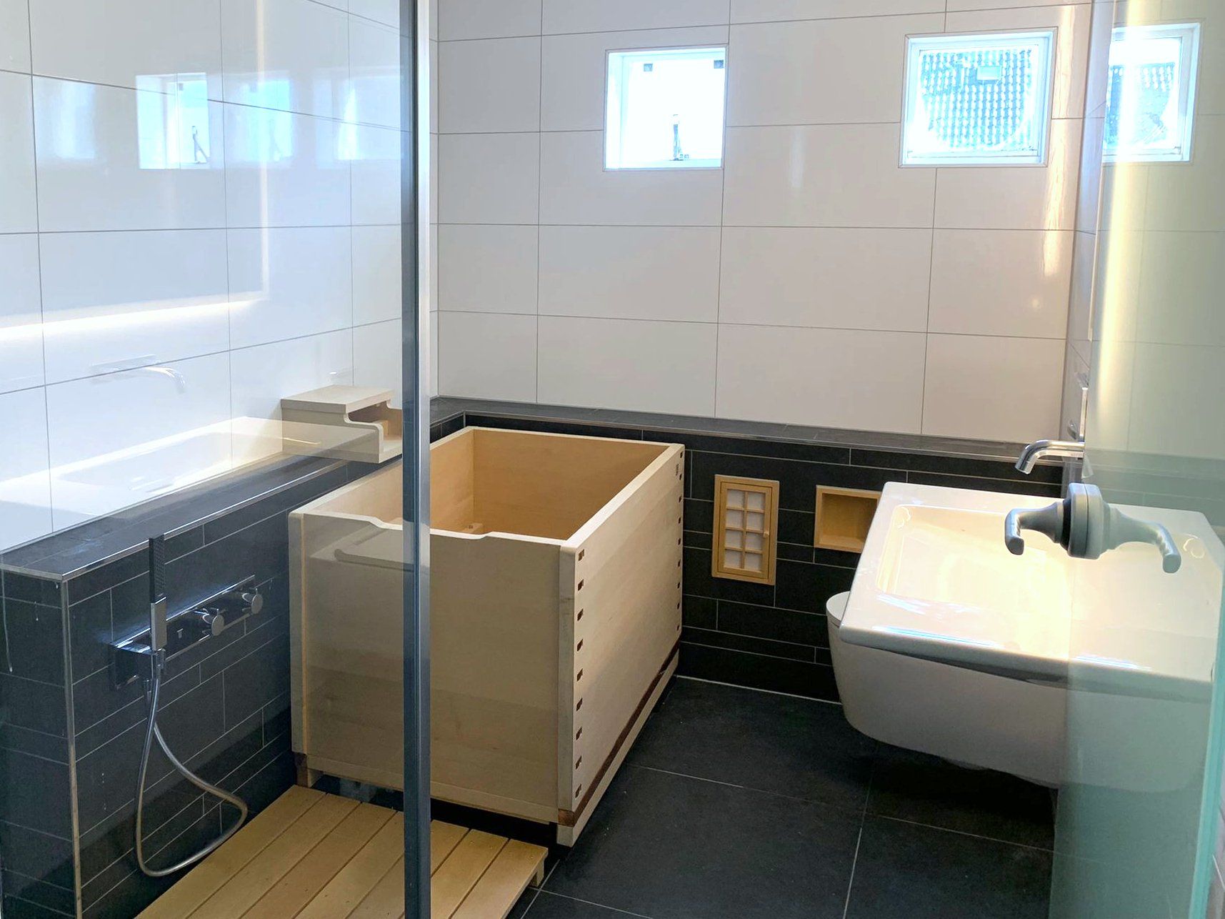 Zowel de badkamer als het toilet zijn uitgevoerd in Japanse stijl. Zo vind je in de badkamer onder andere een volledig houten bad met houten accessoires. Hetgeen dat zowel in de voorbereiding als in de uitvoering de nodige uitdagingen met zich meebrengt. Op het gebruik van sanitair is in deze ruimte niet bezuinigd. Neem bijvoorbeeld het wastafelmeubel met inbouwkraan, waarbij zelfs het sifon in de wand verwerkt is, alsmede de spiegelkast die volledig in de wand verzonken is.